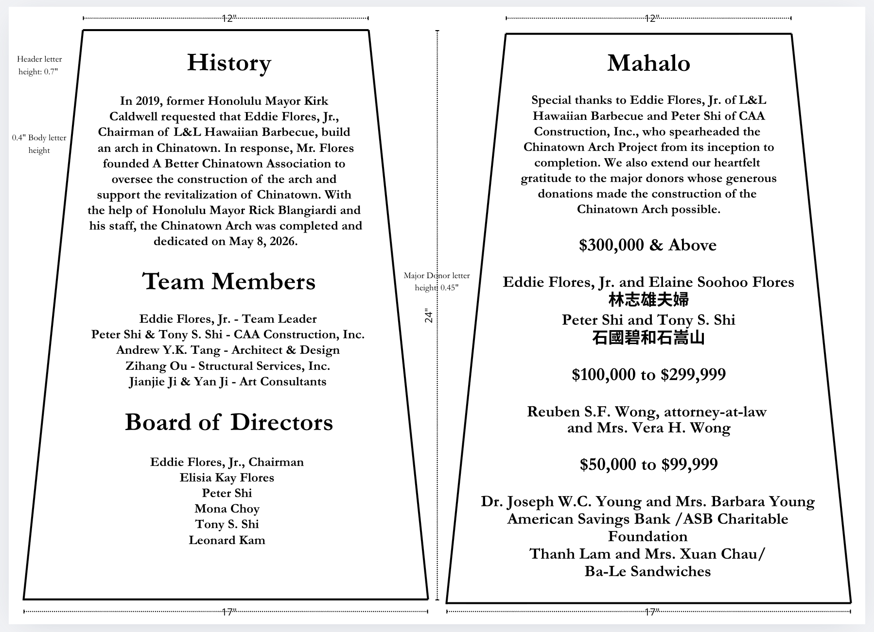 Additionally, Attention Lab contributed graphic design work for the pedestal bases of the first Kekaulike Archway, designing eight panels which will be engraved to honor the history, ABCA team members, and many donors to the project. The eight panels will sit just above eight murals which surround each four-sided pillar bases. The murals were done by a local Honolulu artist and will honor the Chinese immigrants who arrived in Honolulu and established what is now one of the oldest the Chinatown districts in the United States.